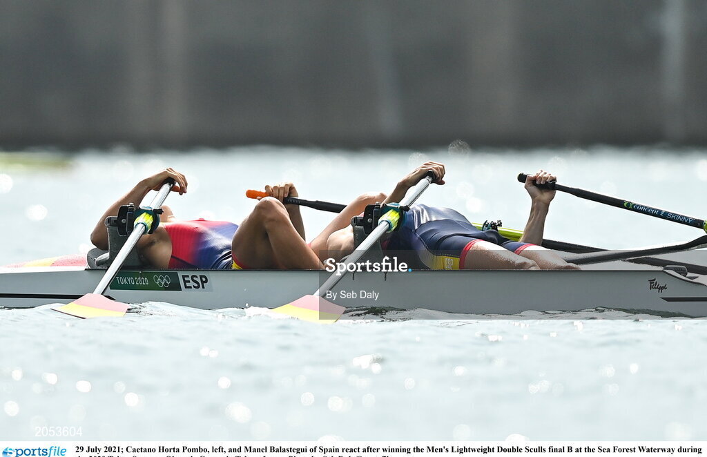29 July 2021; Caetano Horta Pombo, left, and Manel Balastegui of Spain react after winning the Men's Lightweight Double Sculls final B at the Sea Forest Waterway during the 2020 Tokyo Summer Olympic Games in Tokyo, Japan. Photo by Seb Daly/Sportsfile