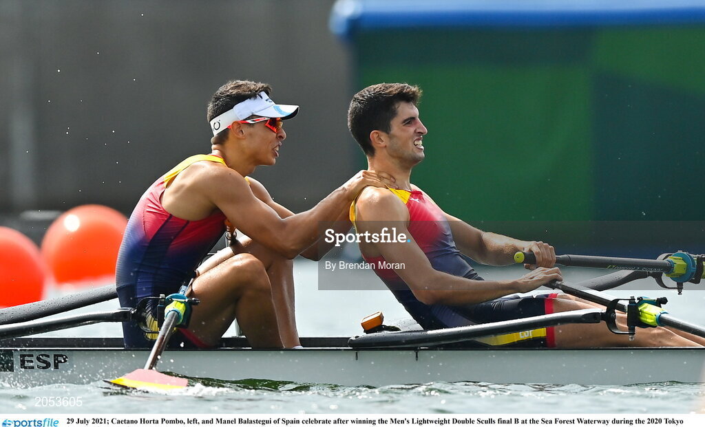 29 July 2021; Caetano Horta Pombo, left, and Manel Balastegui of Spain celebrate after winning the Men's Lightweight Double Sculls final B at the Sea Forest Waterway during the 2020 Tokyo Summer Olympic Games in Tokyo, Japan. Photo by Brendan Moran/Sportsfile