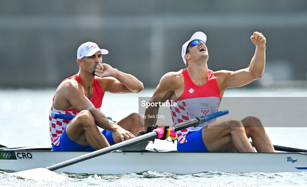 29 July 2021; Martin Sinkovic, left, and Valent Sinkovic of Croatia celebrate after winning the Men's Pair final during the EVENT at the Sea Forest Waterway during the 2020 Tokyo Summer Olympic Games in Tokyo, Japan. Photo by Seb Daly/Sportsfile