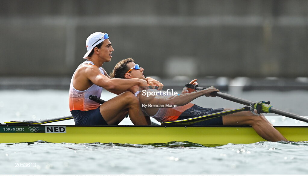 29 July 2021; Niki van Sprang, left, and Guillaume Krommenhoek of Netherlands after winning the Men's Pair final B at the Sea Forest Waterway during the 2020 Tokyo Summer Olympic Games in Tokyo, Japan. Photo by Brendan Moran/Sportsfile
