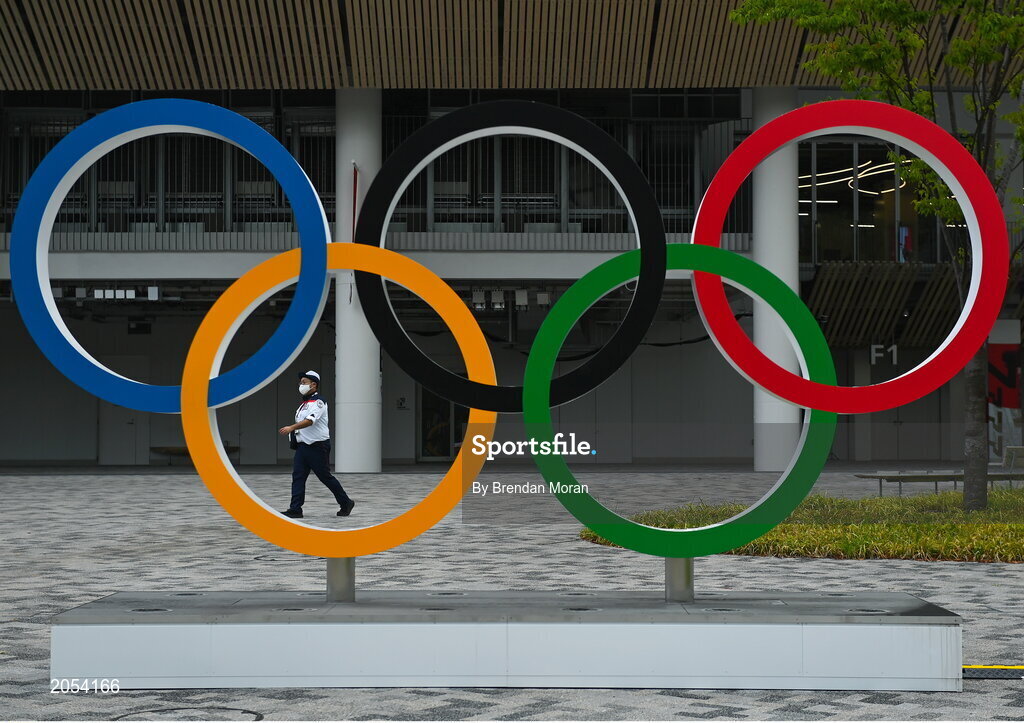 30 July 2021; A security guard on duty outside the Olympic Stadium prior to the first athletics session of the 2020 Tokyo Summer Olympic Games in Tokyo, Japan. Photo by Brendan Moran/Sportsfile