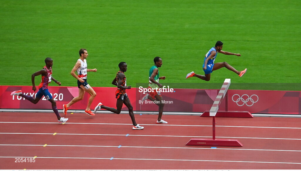 30 July 2021; Avinash Mukund Sable of India leads the field during the men's 3000 metres steeplechase heat 2 at the Olympic Stadium during the 2020 Tokyo Summer Olympic Games in Tokyo, Japan. Photo by Brendan Moran/Sportsfile