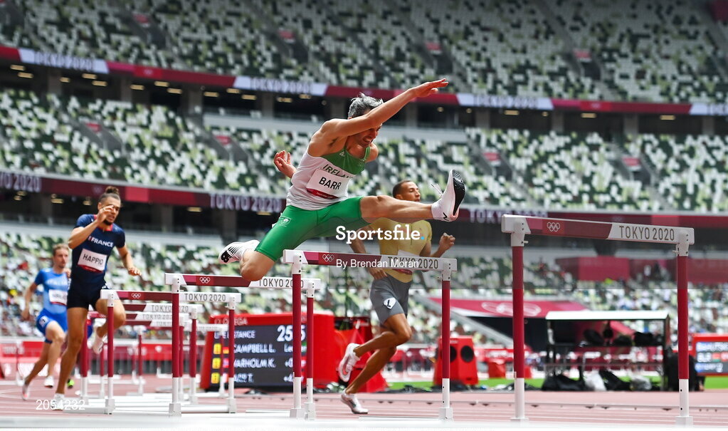 30 July 2021; Thomas Barr of Ireland in action during the his heat of the men's 400 metre hurdles at the Olympic Stadium during the 2020 Tokyo Summer Olympic Games in Tokyo, Japan. Photo by Brendan Moran/Sportsfile