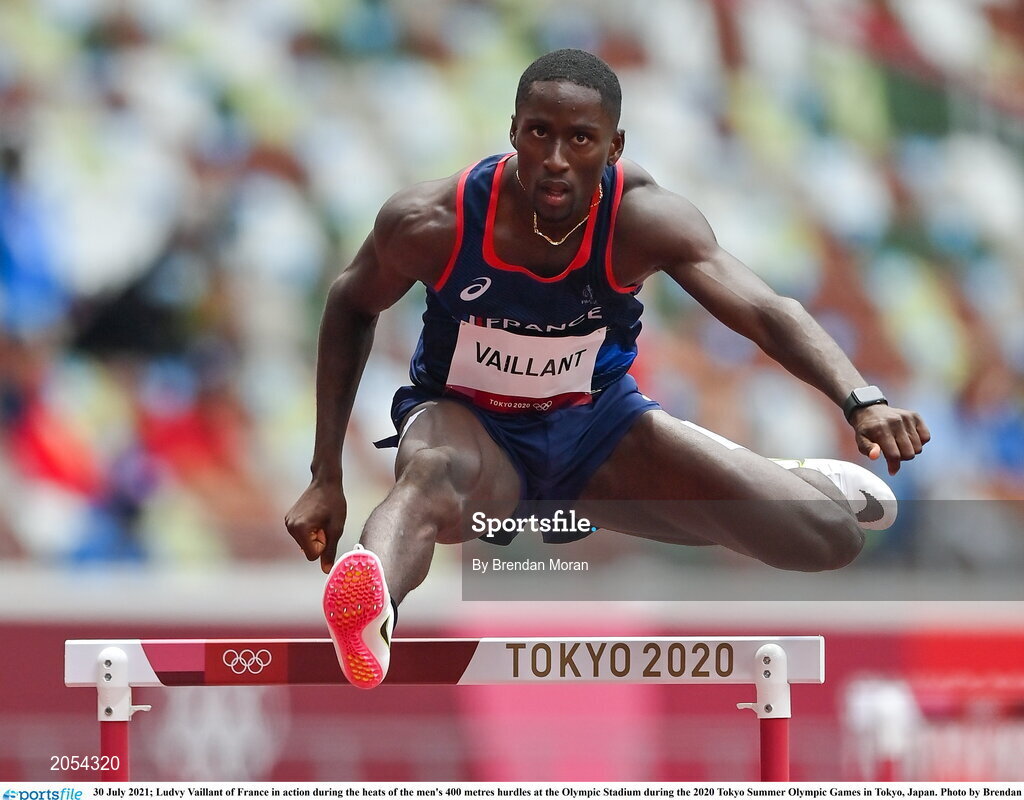 30 July 2021; Ludvy Vaillant of France in action during the heats of the men's 400 metres hurdles at the Olympic Stadium during the 2020 Tokyo Summer Olympic Games in Tokyo, Japan. Photo by Brendan Moran/Sportsfile