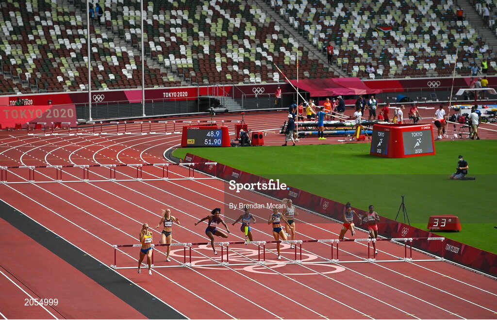 31 July 2021; A general view of the women's 400 metres hurdles as Viktoriya Tkachuk of Ukraine leads the field with the temperature showing 33 degrees celcius at the Olympic Stadium during the 2020 Tokyo Summer Olympic Games in Tokyo, Japan. Photo by Brendan Moran/Sportsfile