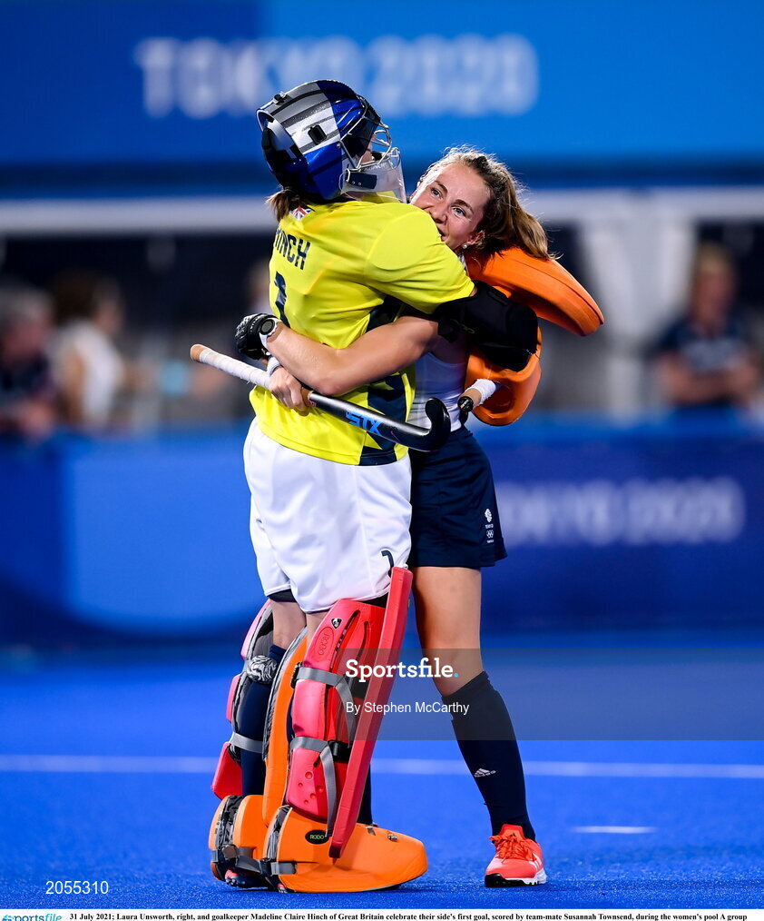 31 July 2021; Laura Unsworth, right, and goalkeeper Madeline Claire Hinch of Great Britain celebrate their side's first goal, scored by team-mate Susannah Townsend, during the women's pool A group stage match between Great Britain and Ireland at the Oi Hockey Stadium during the 2020 Tokyo Summer Olympic Games in Tokyo, Japan. Photo by Stephen McCarthy/Sportsfile