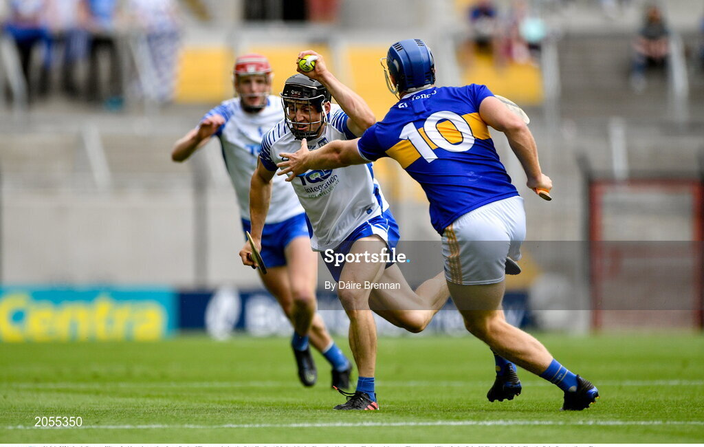 31 July 2021; Jamie Barron of Waterford in action against Jason Forde of Tipperary during the GAA Hurling All-Ireland Senior Championship Quarter-Final match between Tipperary and Waterford at Pairc Ui Chaoimh in Cork. Photo by Daire Brennan/Sportsfile