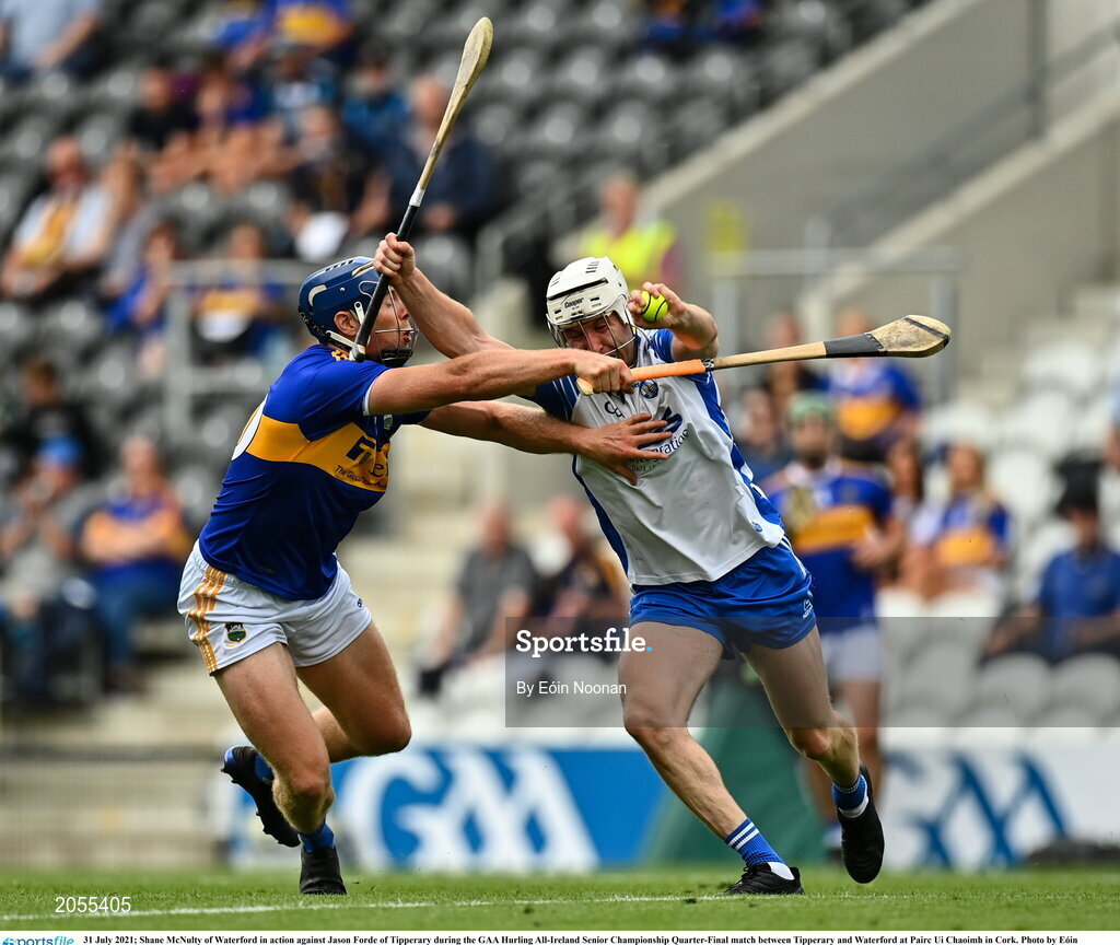 31 July 2021; Shane McNulty of Waterford in action against Jason Forde of Tipperary during the GAA Hurling All-Ireland Senior Championship Quarter-Final match between Tipperary and Waterford at Pairc Ui Chaoimh in Cork. Photo by Eóin Noonan/Sportsfile
