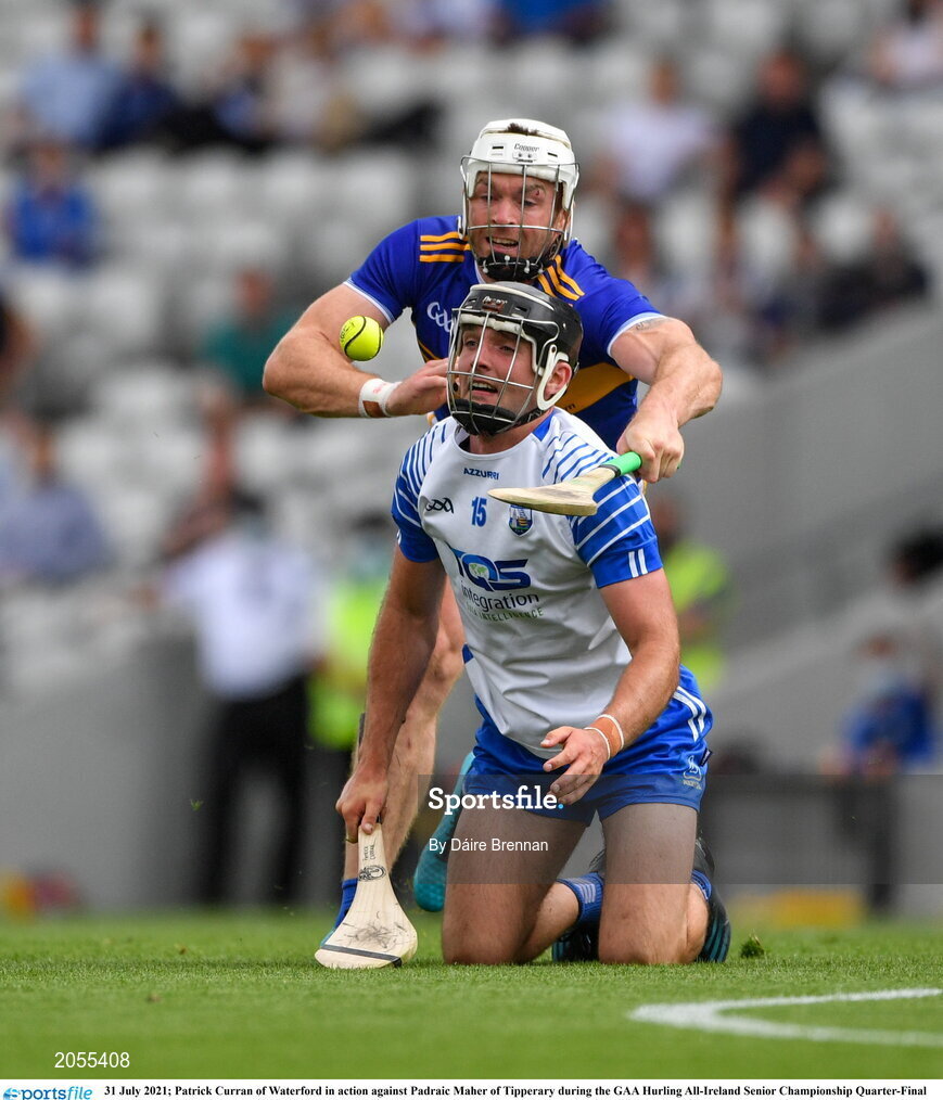 31 July 2021; Patrick Curran of Waterford in action against Padraic Maher of Tipperary during the GAA Hurling All-Ireland Senior Championship Quarter-Final match between Tipperary and Waterford at Pairc Ui Chaoimh in Cork. Photo by Daire Brennan/Sportsfile