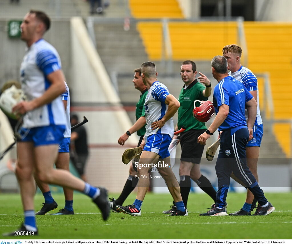 31 July 2021; Waterford manager Liam Cahill protests to referee Colm Lyons during the GAA Hurling All-Ireland Senior Championship Quarter-Final match between Tipperary and Waterford at Pairc Ui Chaoimh in Cork. Photo by Eóin Noonan/Sportsfile