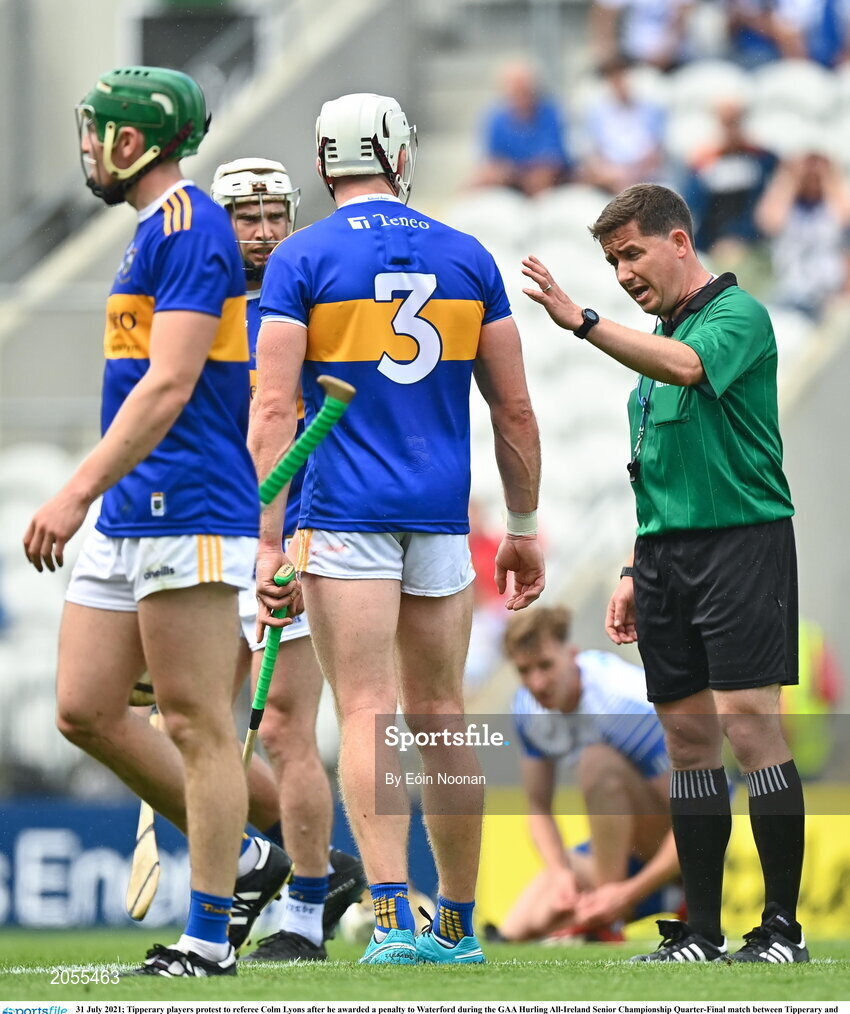 31 July 2021; Tipperary players protest to referee Colm Lyons after he awarded a penalty to Waterford during the GAA Hurling All-Ireland Senior Championship Quarter-Final match between Tipperary and Waterford at Pairc Ui Chaoimh in Cork. Photo by Eóin Noonan/Sportsfile