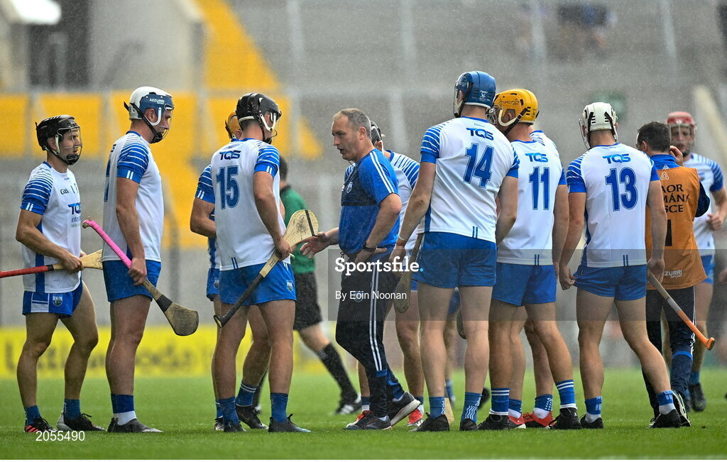 31 July 2021; Waterford manager Liam Cahill speaks to his players during the GAA Hurling All-Ireland Senior Championship Quarter-Final match between Tipperary and Waterford at Pairc Ui Chaoimh in Cork. Photo by Eóin Noonan/Sportsfile