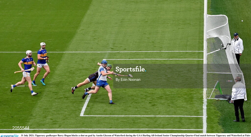 31 July 2021; Tipperary goalkeeper Barry Hogan blocks a shot on goal by Austin Gleeson of Waterford during the GAA Hurling All-Ireland Senior Championship Quarter-Final match between Tipperary and Waterford at Pairc Ui Chaoimh in Cork. Photo by Eóin Noonan/Sportsfile