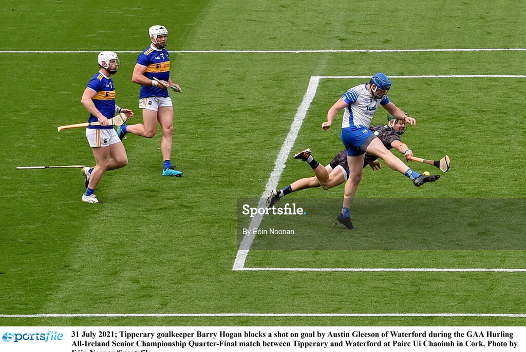 31 July 2021; Tipperary goalkeeper Barry Hogan blocks a shot on goal by Austin Gleeson of Waterford during the GAA Hurling All-Ireland Senior Championship Quarter-Final match between Tipperary and Waterford at Pairc Ui Chaoimh in Cork. Photo by Eóin Noonan/Sportsfile
