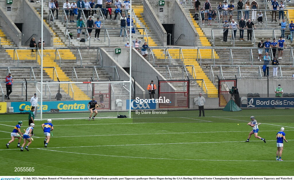 31 July 2021; Stephen Bennett of Waterford scores his side's third goal from a penalty past Tipperary goalkeeper Barry Hogan during the GAA Hurling All-Ireland Senior Championship Quarter-Final match between Tipperary and Waterford at Pairc Ui Chaoimh in Cork. Photo by Daire Brennan/Sportsfile