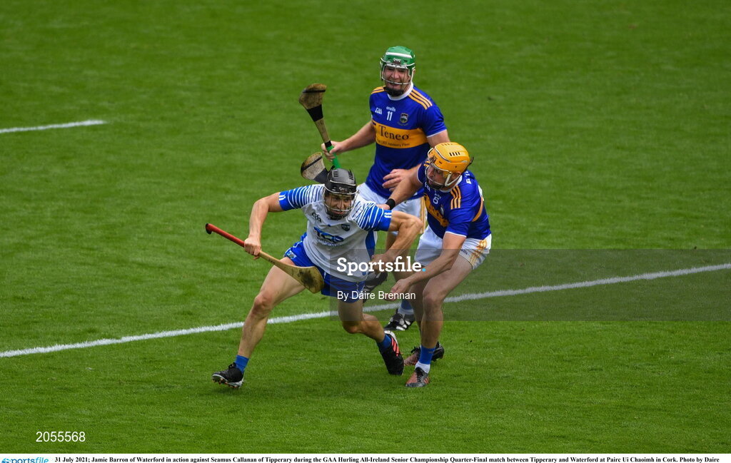 31 July 2021; Jamie Barron of Waterford in action against Seamus Callanan of Tipperary during the GAA Hurling All-Ireland Senior Championship Quarter-Final match between Tipperary and Waterford at Pairc Ui Chaoimh in Cork. Photo by Daire Brennan/Sportsfile