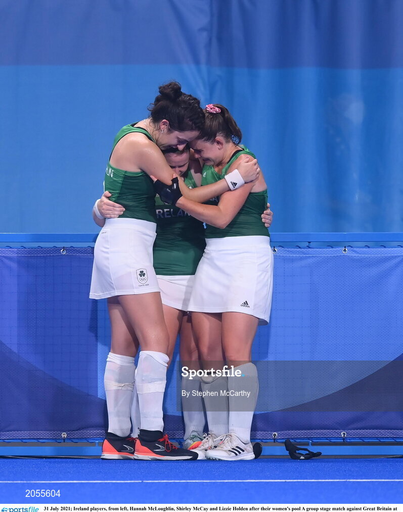 31 July 2021; Ireland players, from left, Hannah McLoughlin, Shirley McCay and Lizzie Holden after their women's pool A group stage match against Great Britain at the Oi Hockey Stadium during the 2020 Tokyo Summer Olympic Games in Tokyo, Japan. Photo by Stephen McCarthy/Sportsfile