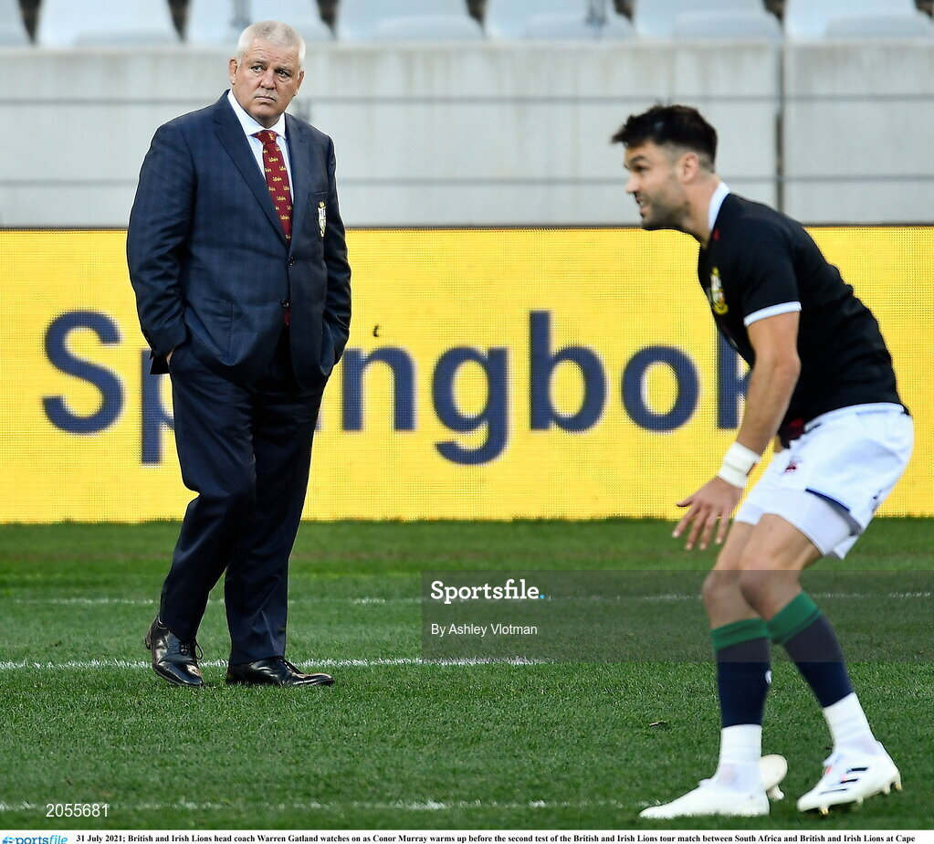 31 July 2021; British and Irish Lions head coach Warren Gatland watches on as Conor Murray warms up before the second test of the British and Irish Lions tour match between South Africa and British and Irish Lions at Cape Town Stadium in Cape Town, South Africa. Photo by Ashley Vlotman/Sportsfile