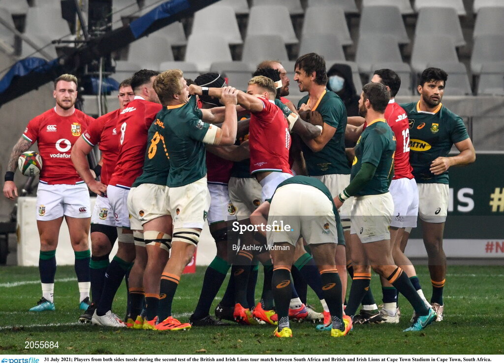 31 July 2021; Players from both sides tussle during the second test of the British and Irish Lions tour match between South Africa and British and Irish Lions at Cape Town Stadium in Cape Town, South Africa. Photo by Ashley Vlotman/Sportsfile