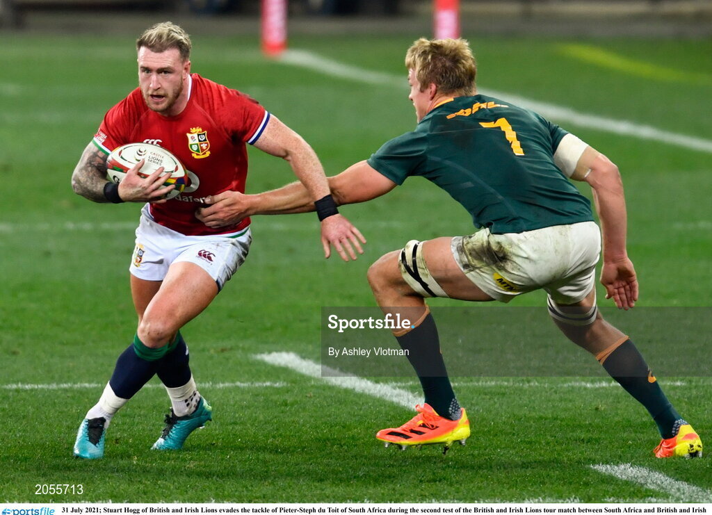 31 July 2021; Stuart Hogg of British and Irish Lions evades the tackle of Pieter-Steph du Toit of South Africa during the second test of the British and Irish Lions tour match between South Africa and British and Irish Lions at Cape Town Stadium in Cape Town, South Africa. Photo by Ashley Vlotman/Sportsfile