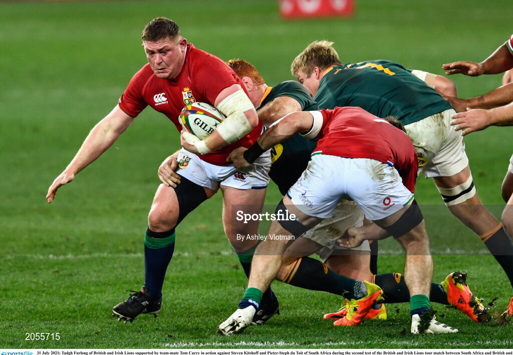 31 July 2021; Tadgh Furlong of British and Irish Lions supported by team-mate Tom Curry in action against Steven Kitshoff and Pieter-Steph du Toit of South Africa during the second test of the British and Irish Lions tour match between South Africa and British and Irish Lions at Cape Town Stadium in Cape Town, South Africa. Photo by Ashley Vlotman/Sportsfile