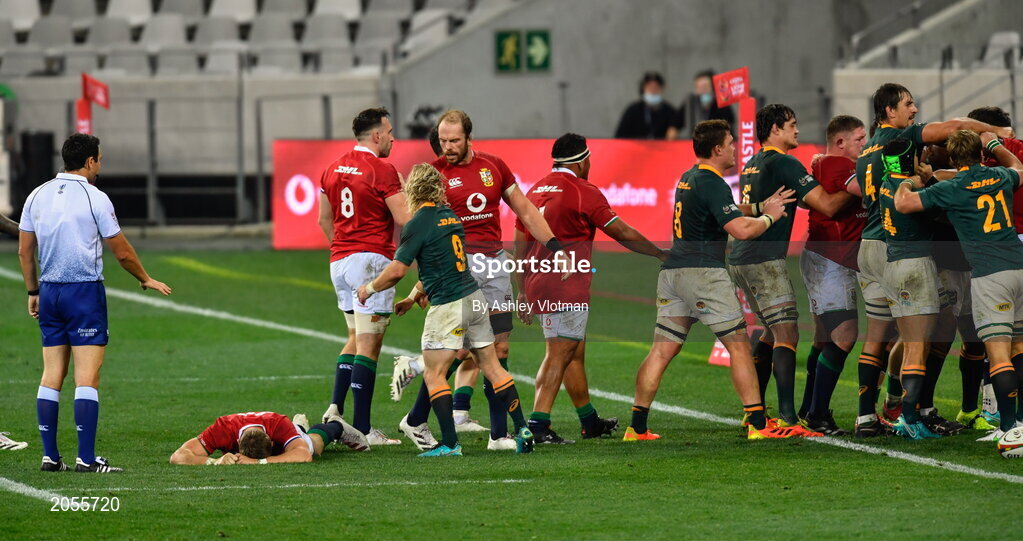 31 July 2021; Players from both sides tussle as Dan Biggar of British and Irish Lions is down with an injury during the second test of the British and Irish Lions tour match between South Africa and British and Irish Lions at Cape Town Stadium in Cape Town, South Africa. Photo by Ashley Vlotman/Sportsfile