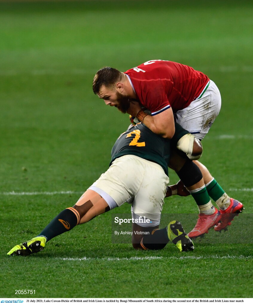 31 July 2021; Luke Cowan-Dickie of British and Irish Lions is tackled by Bongi Mbonambi of South Africa during the second test of the British and Irish Lions tour match between South Africa and British and Irish Lions at Cape Town Stadium in Cape Town, South Africa. Photo by Ashley Vlotman/Sportsfile