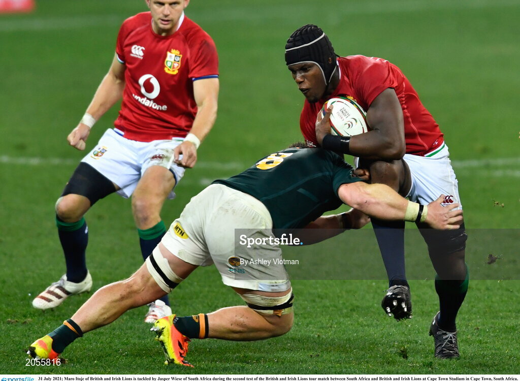 31 July 2021; Maro Itoje of British and Irish Lions is tackled by Jasper Wiese of South Africa during the second test of the British and Irish Lions tour match between South Africa and British and Irish Lions at Cape Town Stadium in Cape Town, South Africa. Photo by Ashley Vlotman/Sportsfile