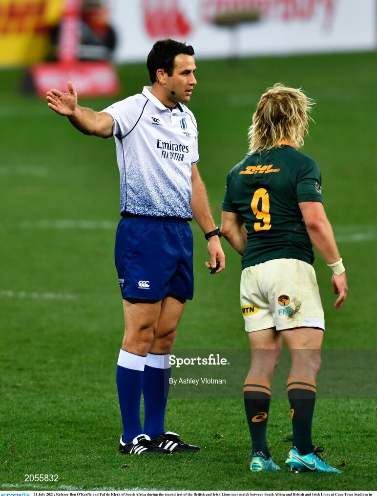 31 July 2021; Referee Ben O'Keeffe and Faf de Klerk of South Africa during the second test of the British and Irish Lions tour match between South Africa and British and Irish Lions at Cape Town Stadium in Cape Town, South Africa. Photo by Ashley Vlotman/Sportsfile