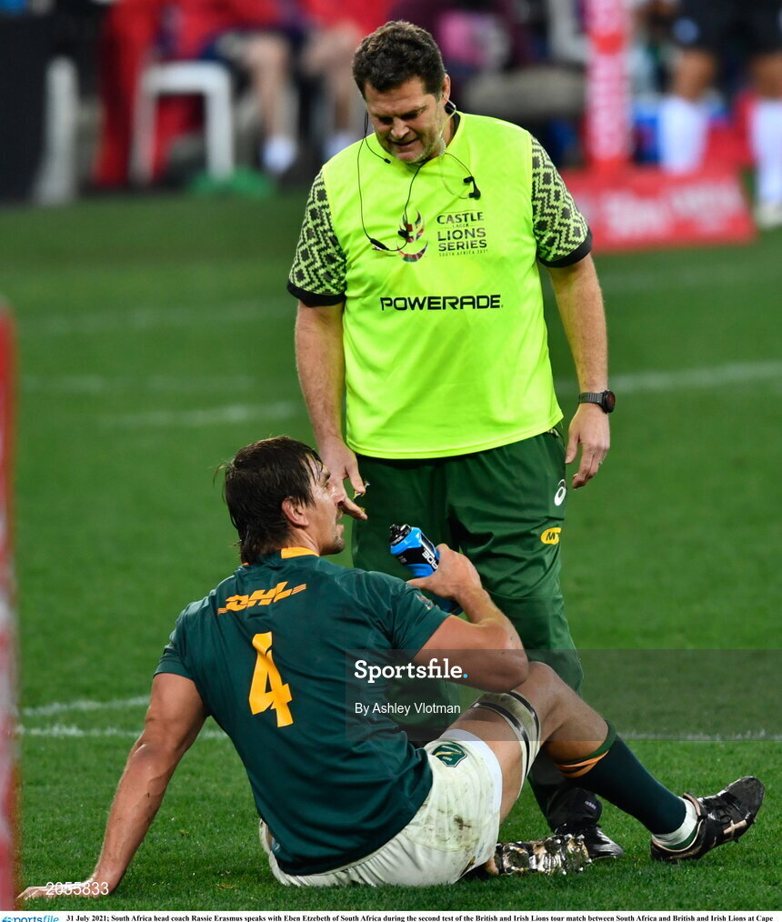 31 July 2021; South Africa head coach Rassie Erasmus speaks with Eben Etzebeth of South Africa during the second test of the British and Irish Lions tour match between South Africa and British and Irish Lions at Cape Town Stadium in Cape Town, South Africa. Photo by Ashley Vlotman/Sportsfile