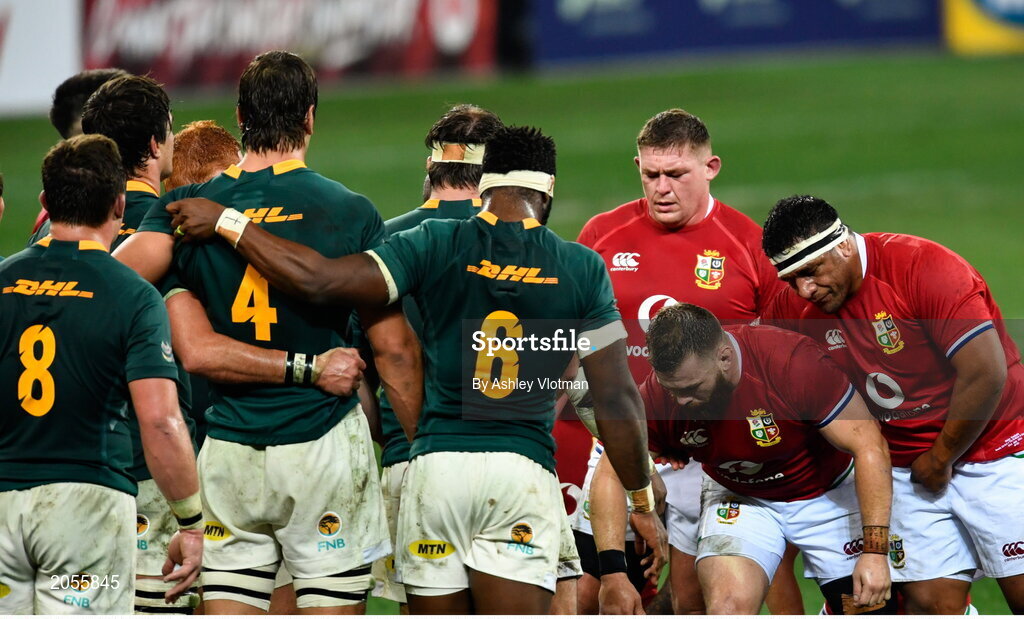 31 July 2021; Tadhg Furlong of British and Irish Lions, third right, and team-mates prepare to scrum with South Africa during the second test of the British and Irish Lions tour match between South Africa and British and Irish Lions at Cape Town Stadium in Cape Town, South Africa. Photo by Ashley Vlotman/Sportsfile