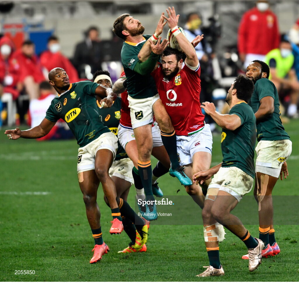 31 July 2021; Willie le Roux of South Africa and Robbie Henshaw of British and Irish Lions compete for a high ball during the second test of the British and Irish Lions tour match between South Africa and British and Irish Lions at Cape Town Stadium in Cape Town, South Africa. Photo by Ashley Vlotman/Sportsfile
