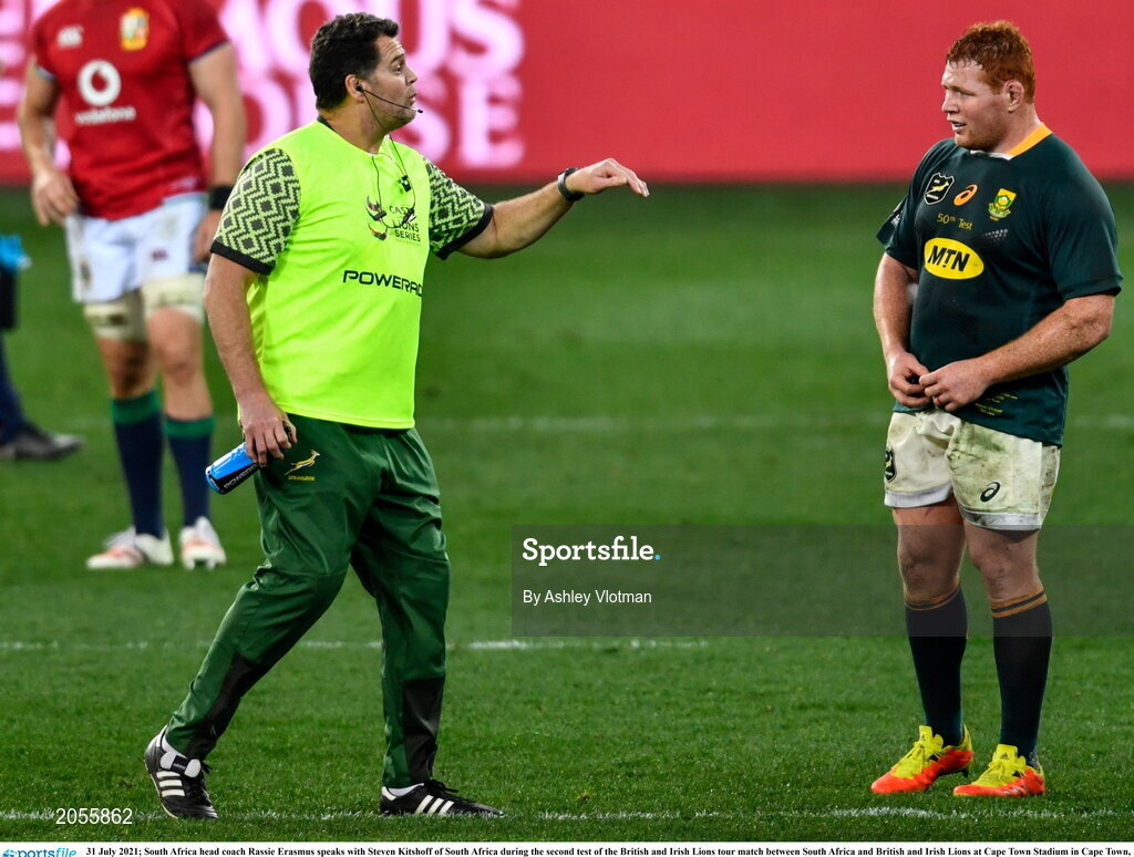 31 July 2021; South Africa head coach Rassie Erasmus speaks with Steven Kitshoff of South Africa during the second test of the British and Irish Lions tour match between South Africa and British and Irish Lions at Cape Town Stadium in Cape Town, South Africa. Photo by Ashley Vlotman/Sportsfile