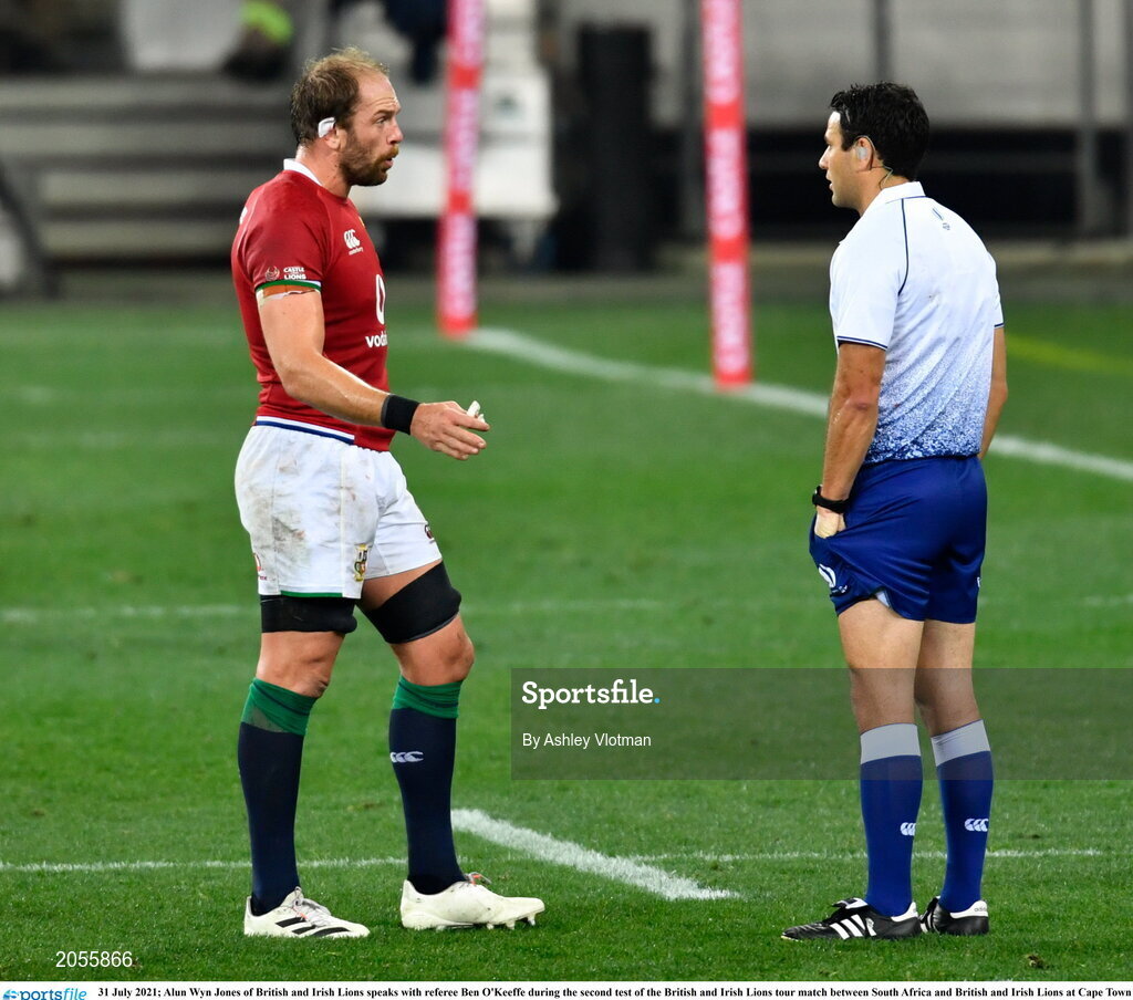 31 July 2021; Alun Wyn Jones of British and Irish Lions speaks with referee Ben O'Keeffe during the second test of the British and Irish Lions tour match between South Africa and British and Irish Lions at Cape Town Stadium in Cape Town, South Africa. Photo by Ashley Vlotman/Sportsfile