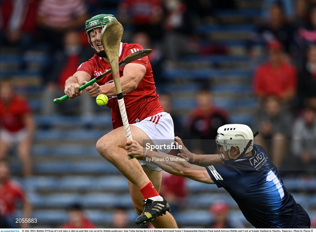 31 July 2021; Robbie O'Flynn of Cork takes a shot on goal that was saved by Dublin goalkeeper Alan Nolan during the GAA Hurling All-Ireland Senior Championship Quarter-Final match between Dublin and Cork at Semple Stadium in Thurles, Tipperary. Photo by Piaras Ó Mídheach/Sportsfile