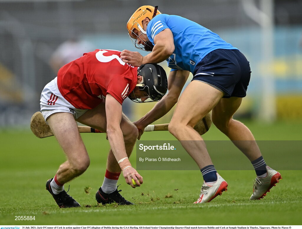 31 July 2021; Jack O'Connor of Cork in action against Cian O'Callaghan of Dublin during the GAA Hurling All-Ireland Senior Championship Quarter-Final match between Dublin and Cork at Semple Stadium in Thurles, Tipperary. Photo by Piaras Ó Mídheach/Sportsfile