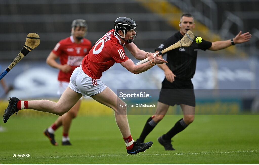 31 July 2021; Conor Cahalane of Cork passes the ball as referee James Owens signals for play to continue during the GAA Hurling All-Ireland Senior Championship Quarter-Final match between Dublin and Cork at Semple Stadium in Thurles, Tipperary. Photo by Piaras Ó Mídheach/Sportsfile