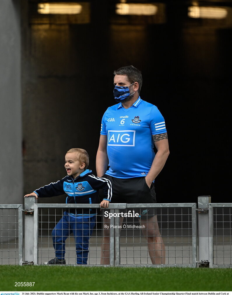 31 July 2021; Dublin supporters Mark Ryan with his son Mark Jnr, age 3, from Inchicore, at the GAA Hurling All-Ireland Senior Championship Quarter-Final match between Dublin and Cork at Semple Stadium in Thurles, Tipperary. Photo by Piaras Ó Mídheach/Sportsfile