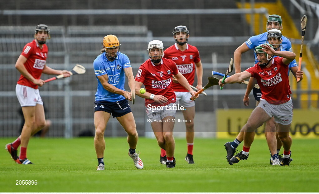 31 July 2021; Cian O'Callaghan of Dublin in action against Luke Meade, 9, and Robbie O'Flynn of Cork during the GAA Hurling All-Ireland Senior Championship Quarter-Final match between Dublin and Cork at Semple Stadium in Thurles, Tipperary. Photo by Piaras Ó Mídheach/Sportsfile