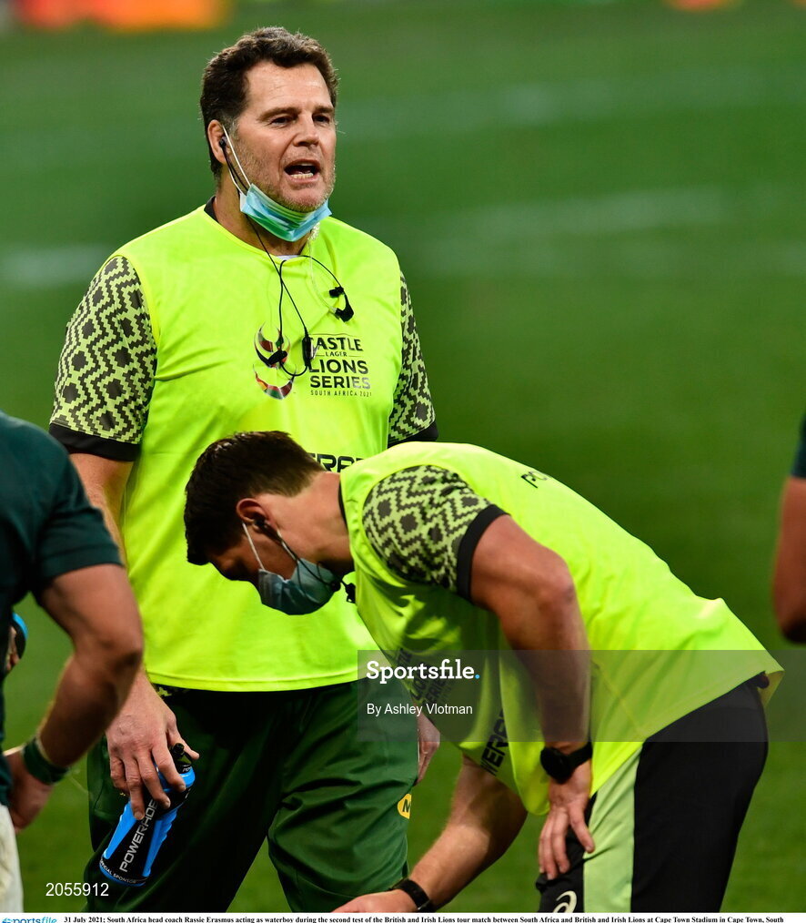 31 July 2021; South Africa head coach Rassie Erasmus acting as waterboy during the second test of the British and Irish Lions tour match between South Africa and British and Irish Lions at Cape Town Stadium in Cape Town, South Africa. Photo by Ashley Vlotman/Sportsfile