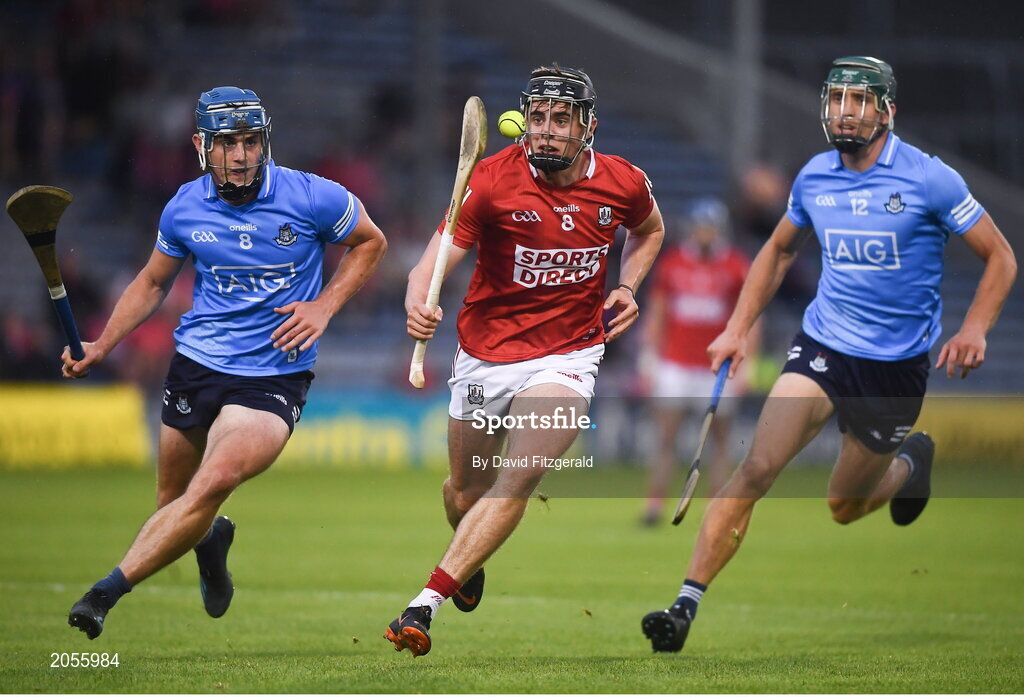 31 July 2021; Darragh Fitzgibbon of Cork in action against Rian McBride, left, and Chris Crummey of Dublin during the GAA Hurling All-Ireland Senior Championship Quarter-Final match between Dublin and Cork at Semple Stadium in Thurles, Tipperary. Photo by David Fitzgerald/Sportsfile