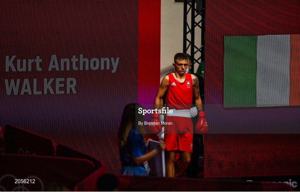 1 August 2021; Kurt Walker of Ireland walks to the ring for his men's featherweight quarter-final bout against Duke Ragan of USA at the Kokugikan Arena during the 2020 Tokyo Summer Olympic Games in Tokyo, Japan. Photo by Brendan Moran/Sportsfile