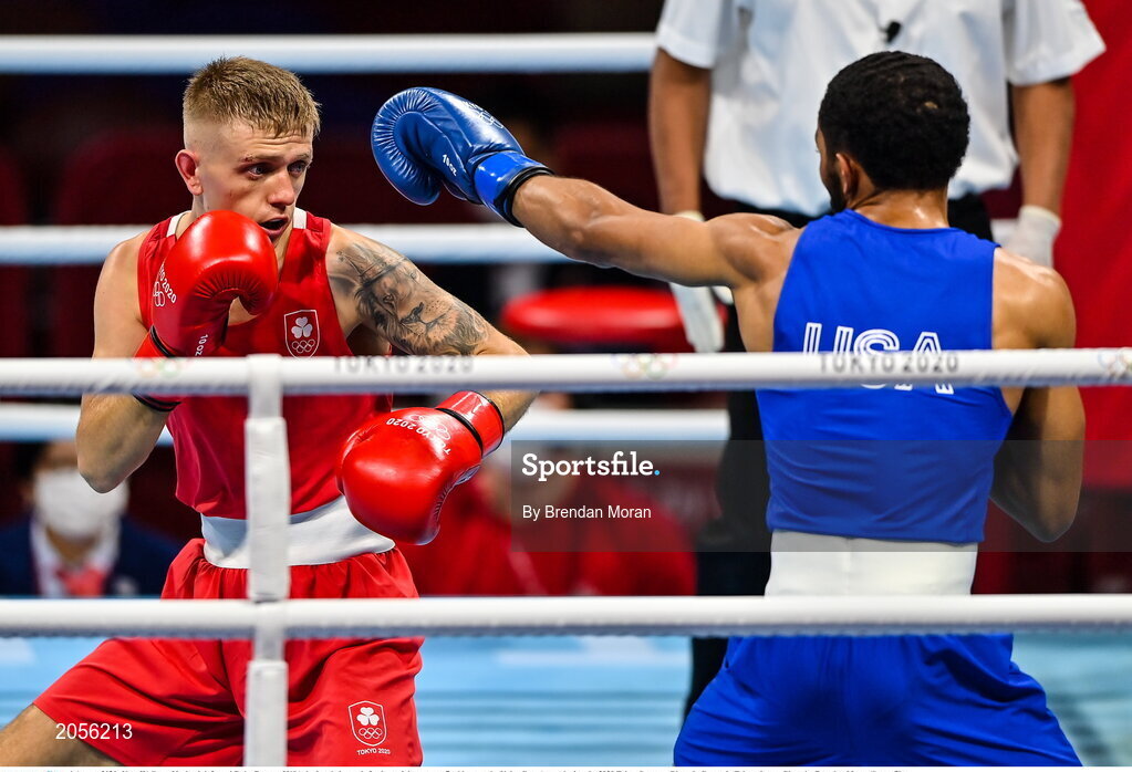 1 August 2021; Kurt Walker of Ireland, left, and Duke Ragan of USA during their men's featherweight quarter-final bout at the Kokugikan Arena during the 2020 Tokyo Summer Olympic Games in Tokyo, Japan. Photo by Brendan Moran/Sportsfile