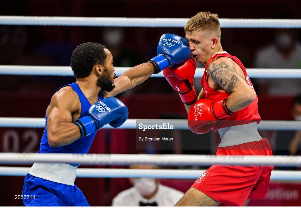 1 August 2021; Kurt Walker of Ireland, right, and Duke Ragan of USA during their men's featherweight quarter-final bout at the Kokugikan Arena during the 2020 Tokyo Summer Olympic Games in Tokyo, Japan. Photo by Brendan Moran/Sportsfile