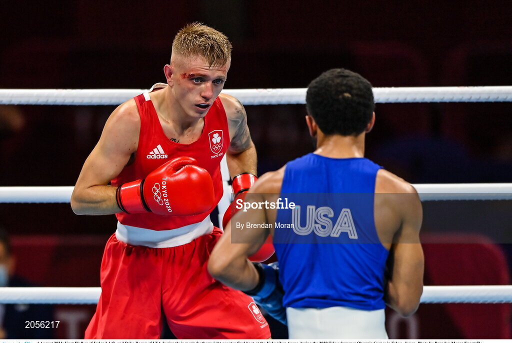 1 August 2021; Kurt Walker of Ireland, left, and Duke Ragan of USA during their men's featherweight quarter-final bout at the Kokugikan Arena during the 2020 Tokyo Summer Olympic Games in Tokyo, Japan. Photo by Brendan Moran/Sportsfile
