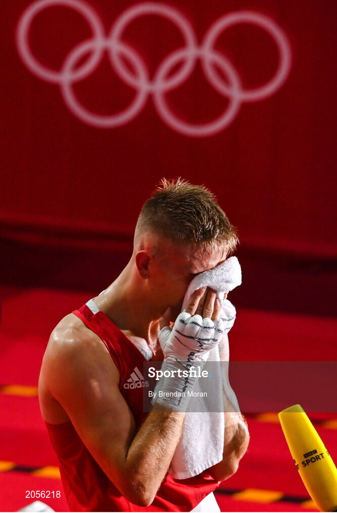 1 August 2021; Kurt Walker of Ireland after his men's featherweight quarter-final bout with Duke Ragan of USA at the Kokugikan Arena during the 2020 Tokyo Summer Olympic Games in Tokyo, Japan. Photo by Brendan Moran/Sportsfile