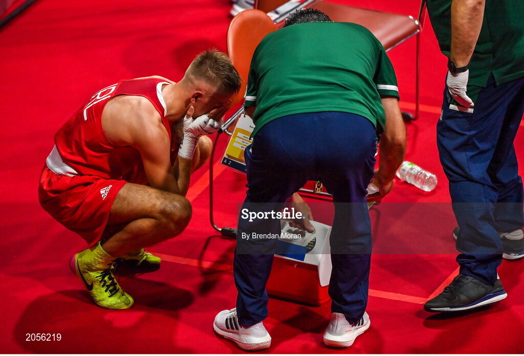 1 August 2021; Kurt Walker of Ireland reacts after his men's featherweight quarter-final bout with Duke Ragan of USA at the Kokugikan Arena during the 2020 Tokyo Summer Olympic Games in Tokyo, Japan. Photo by Brendan Moran/Sportsfile