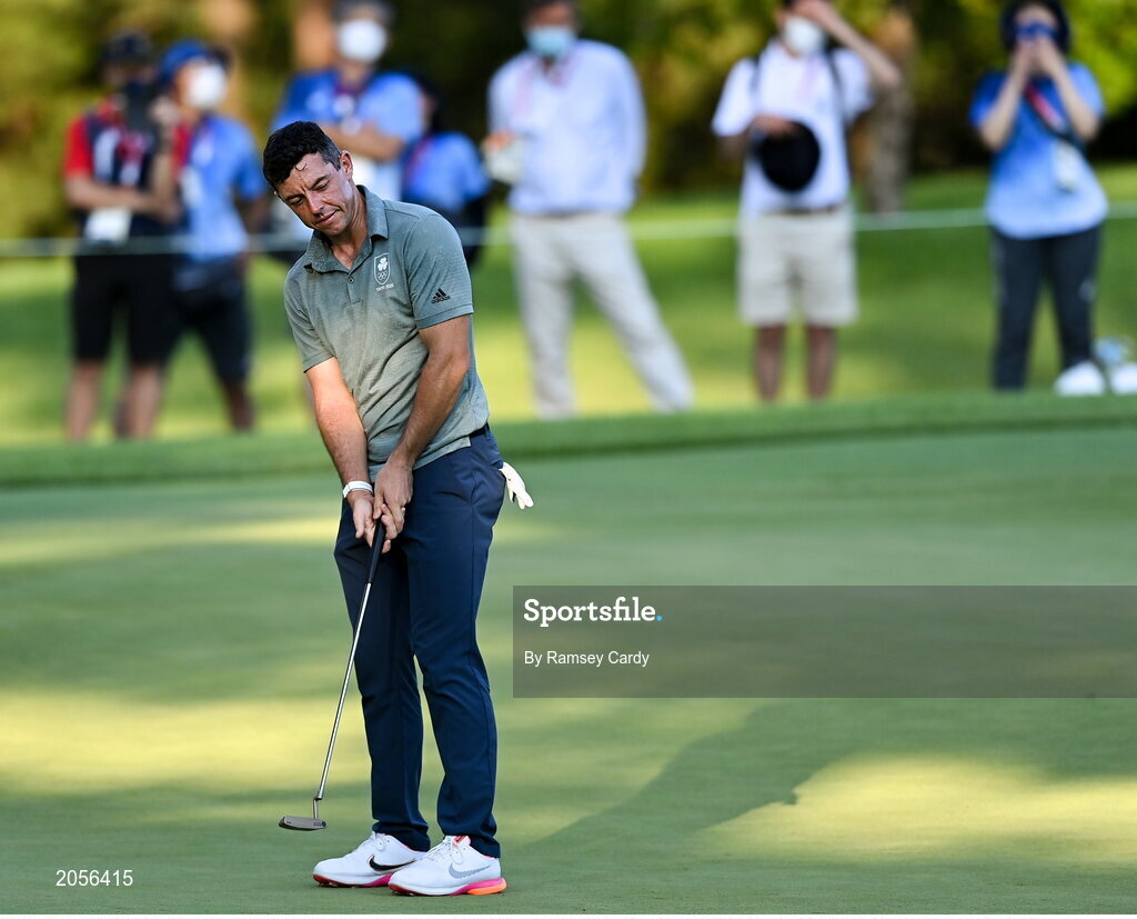 1 August 2021; Rory McIlroy of Ireland reacts to a missed putt on the 11th during the bronze medal play-off in round 4 of the men's individual stroke play at the Kasumigaseki Country Club during the 2020 Tokyo Summer Olympic Games in Kawagoe, Saitama, Japan. Photo by Ramsey Cardy/Sportsfile