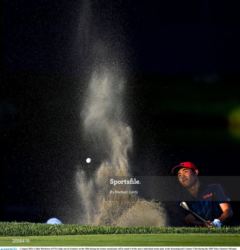 1 August 2021; Collin Morikawa of USA chips out of a bunker on the 18th during the bronze medal play-off in round 4 of the men's individual stroke play at the Kasumigaseki Country Club during the 2020 Tokyo Summer Olympic Games in Kawagoe, Saitama, Japan. Photo by Ramsey Cardy/Sportsfile