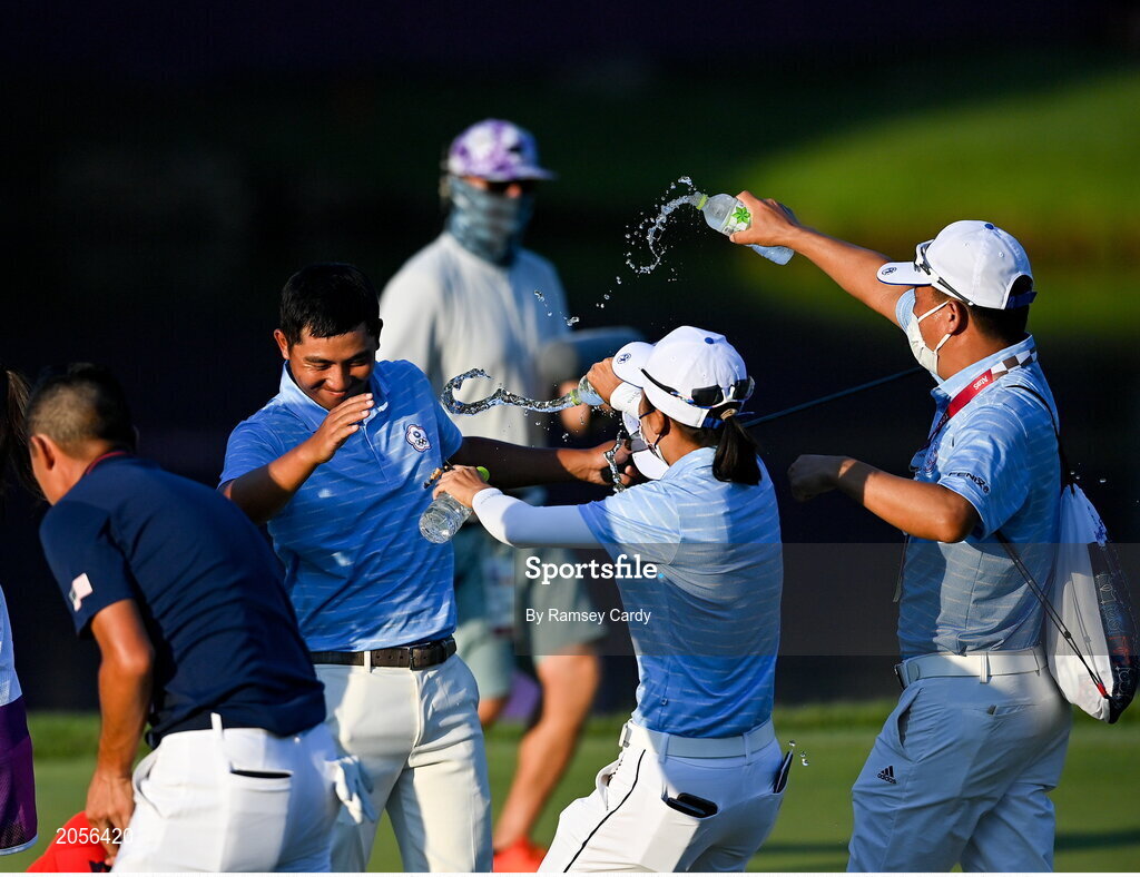 1 August 2021; CT Pan of Chinese Taipei celebrates with team-mates after winning the bronze medal play-off in round 4 of the men's individual stroke play at the Kasumigaseki Country Club during the 2020 Tokyo Summer Olympic Games in Kawagoe, Saitama, Japan. Photo by Ramsey Cardy/Sportsfile